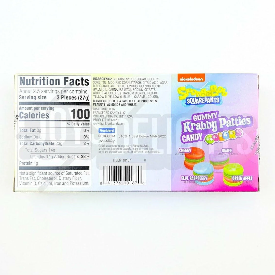 Ingredients: Glucose Syrup, Sugar, Gelatin, Sorbitol, Modified Corn Starch, Citric Acid, Agar, Malic Acid, Artificial Flavours, Glazing Agent (Coconut Oil, Carnauba Wax),Sodium Citrate, Artifical Colours (Red 40, Yellow 5, Yellow 6, Blue 1, Caramel Colour).