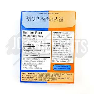 Dextrose, Maltodextrin, Malic Acid, and less than 2% of Calcium Stearate, Corn Syrup, Artificial Flavors, Carnauba Wax, Carmine Color, Color Added, Blue 1 Lake, Blue 2 Lake, Red 129 Lake, Yellow 5 Lake, Yellow 6 Lake.