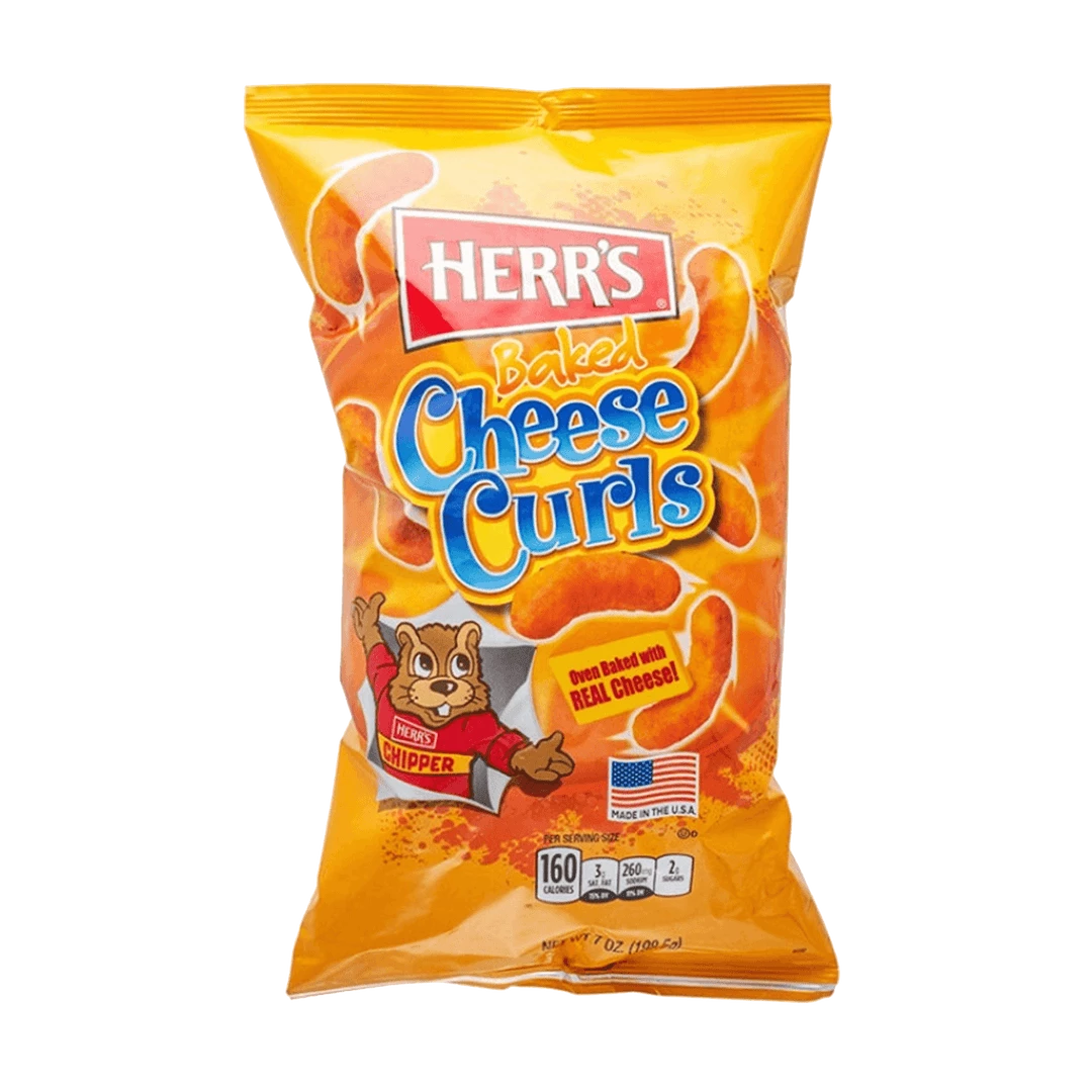 Herr’s® Cheese Curls are a big favorited with kids of all ages. And why not – their great taste makes any snack or meal extra special. You can feel good about giving your family Herr’s Cheese Curls. We use only real cheese – our own special blend of natural cheddars. The curls are made from pure corn meal, and are then baked, not fried, so they’re light and fluffy.