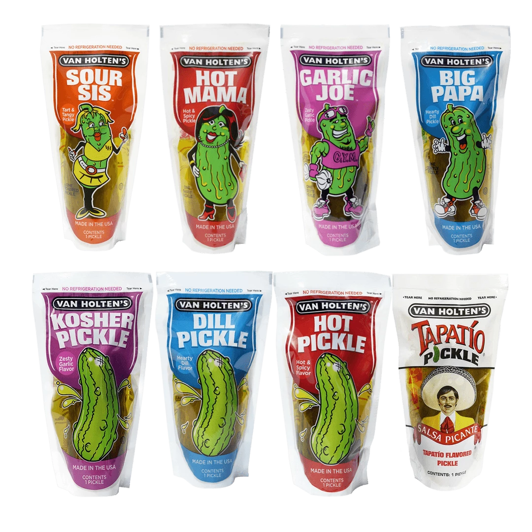Big Papa, Hot Mama, Sour Siss, Garlic Joe, Dill, Hot, Kosher Garlic & Tapatio.