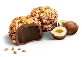 Milk chocolate truffle with hazelnut flavoured centre covered in caramelised hazelnut pieces.